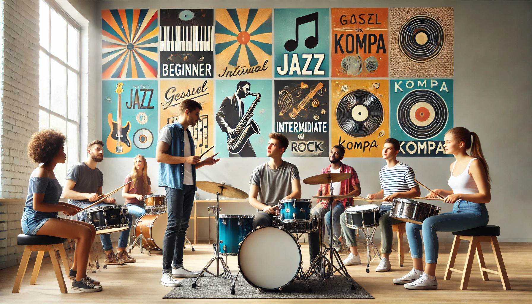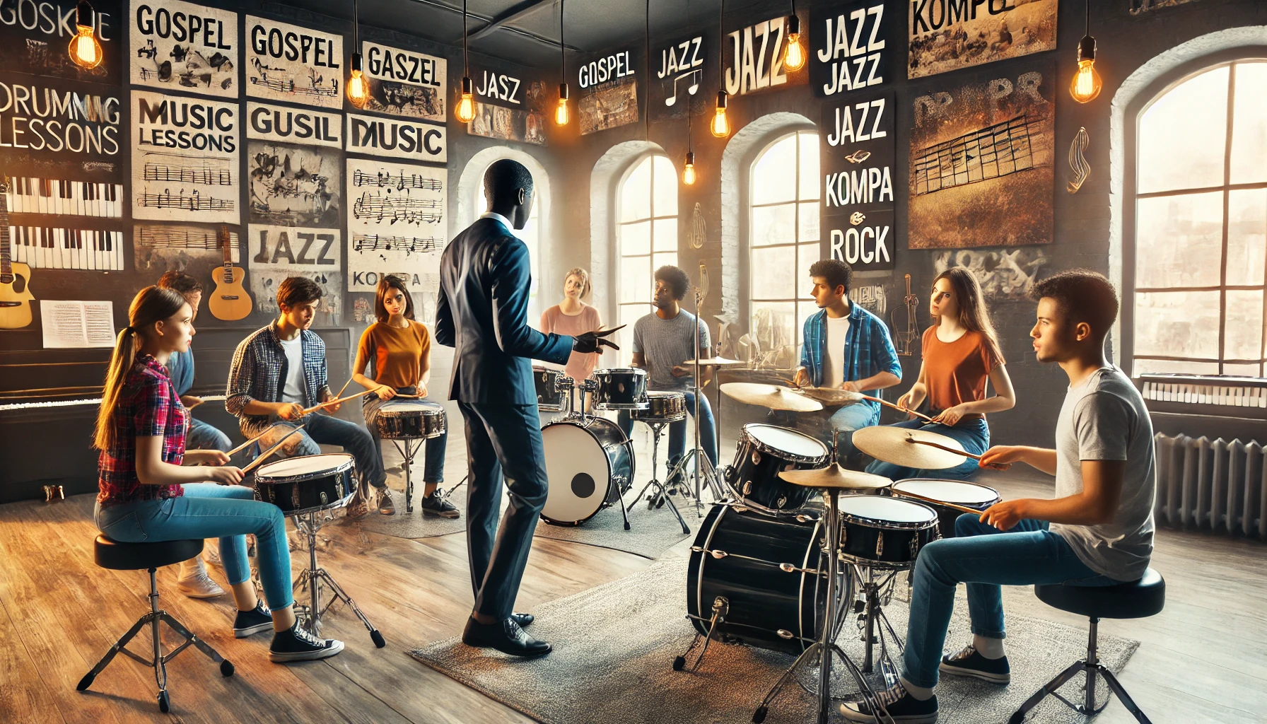 Une salle de musique conviviale où des élèves de différents niveaux pratiquent des rythmes sous la supervision d’un instructeur.